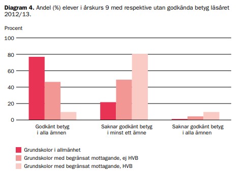 Det finns en studie gjord av Skolverket 2014 som kartlagt resursskolor i Sverige. Ser man till alla resursskolor så går 31% av eleverna ut åk 9 med fullständiga betyg. Det är att jämföra med Helleborusskolan i Österåker där 50% går ut åk 9 med fullständiga betyg. De har även gjort en uppdelning där man kan se att elever som går i resursskola som inte är kopplad till ett HVB-hem där hade strax under 50% av eleverna godkänt i alla ämnen (se diagram 4 nedan) och 65% gick ut med behörighet till yrkesprogram (se diagram 5 nedan).